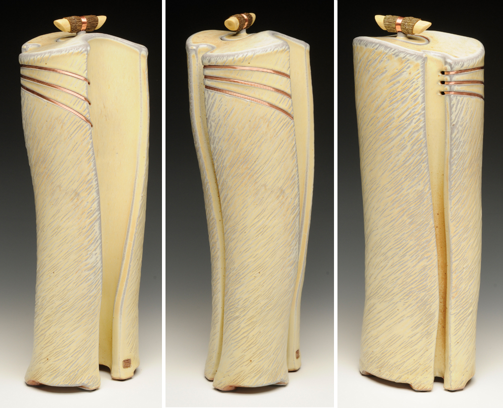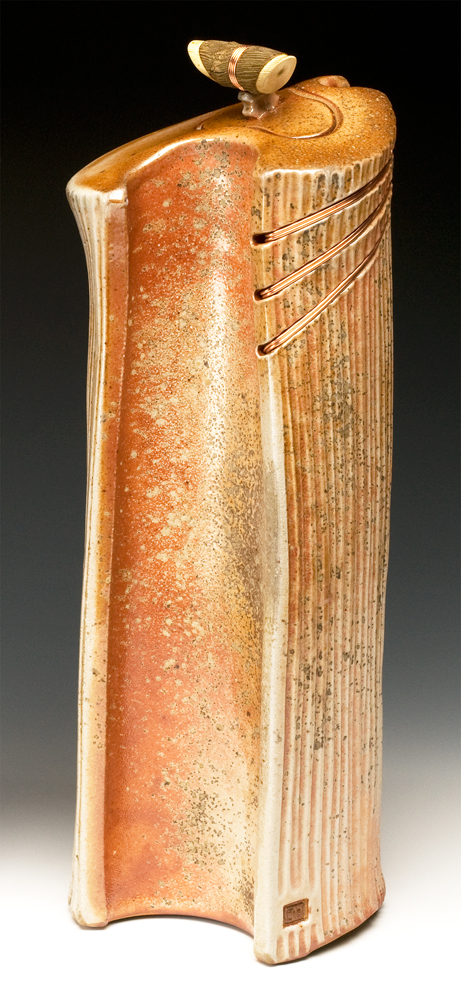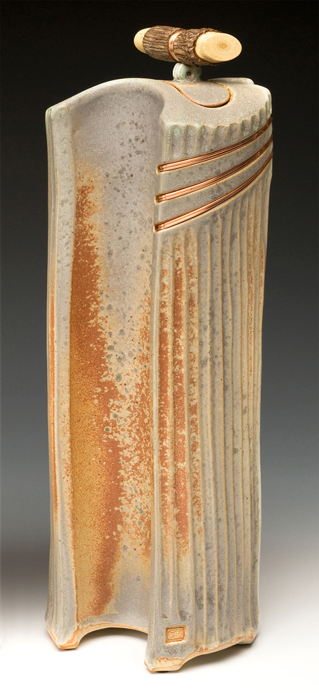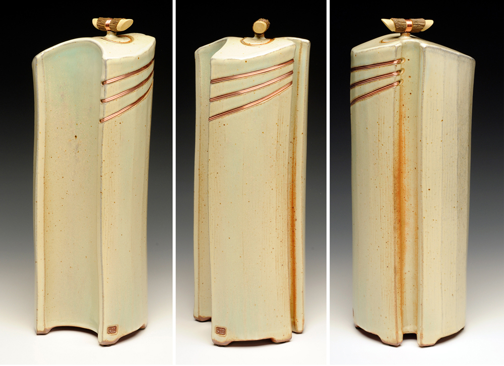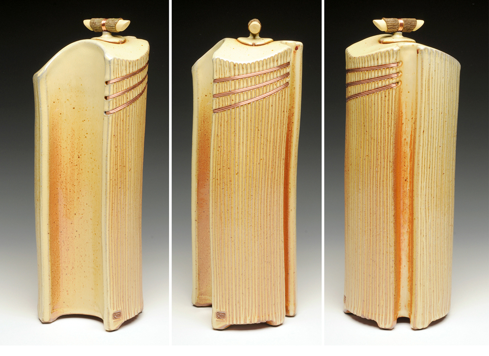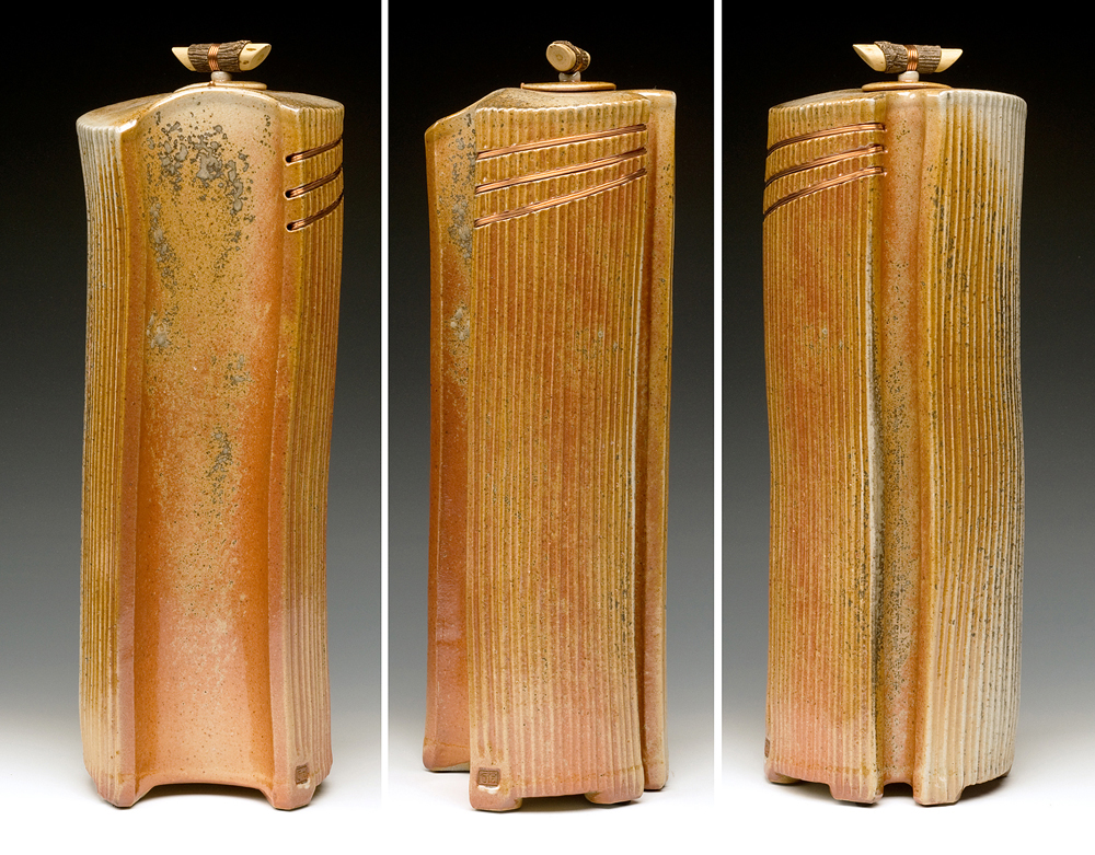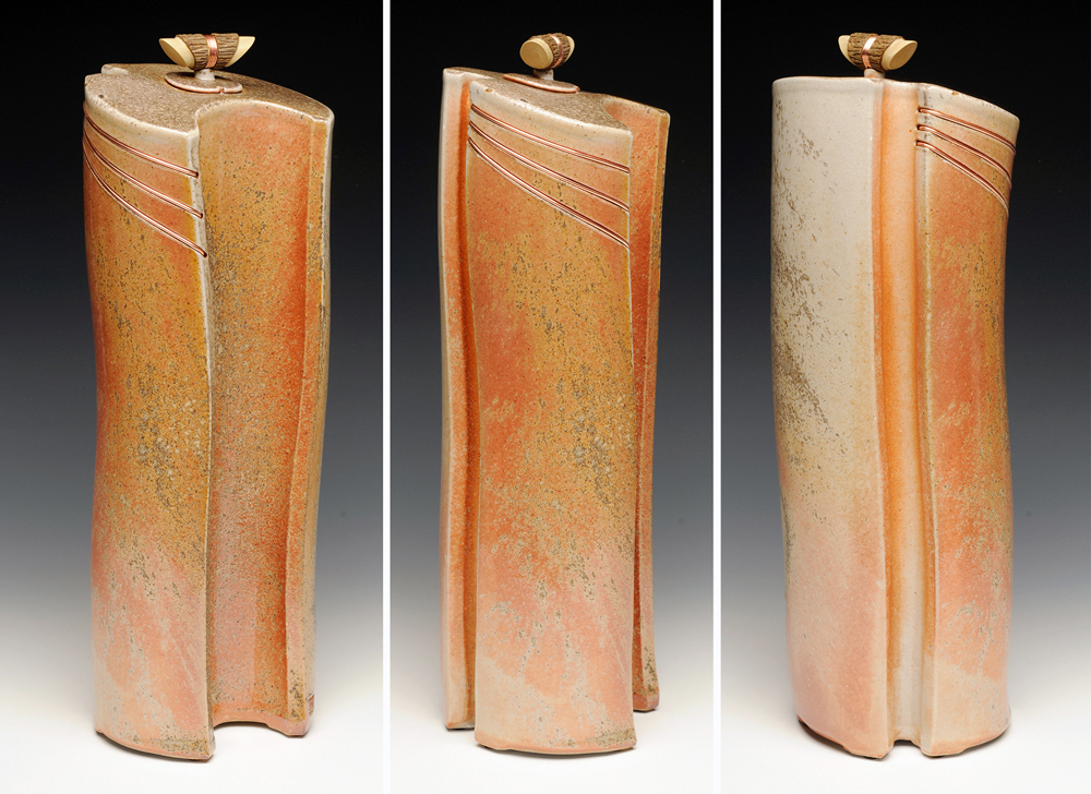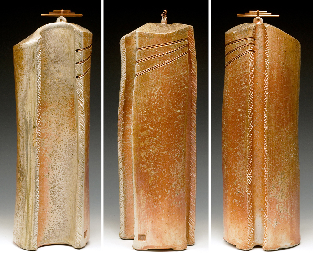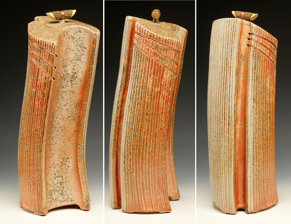 The below work consists mostly of wood/salt-fired, hand-built, medium to large vessels (~12″- 19″ tall) using rolled slabs, extruded and wheel thrown forms. The vessels with lids have special handmade copper or copper/wood finials.