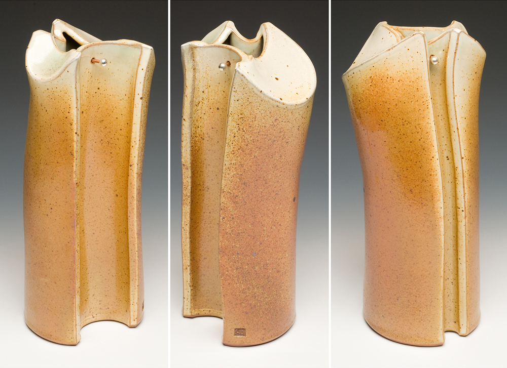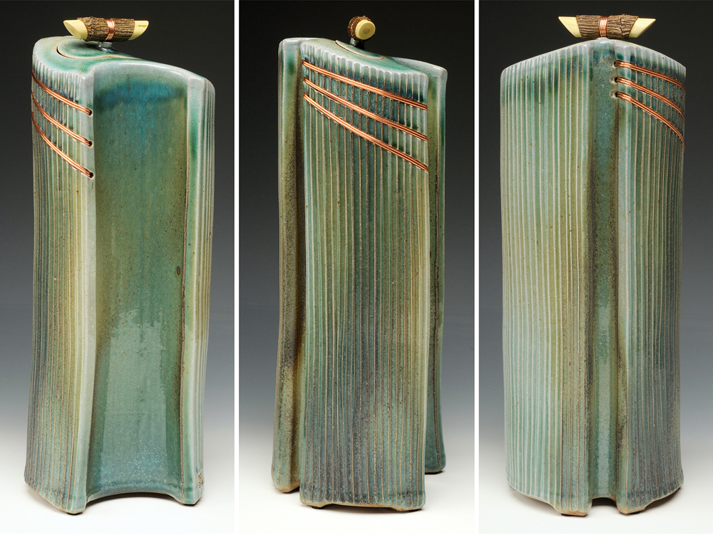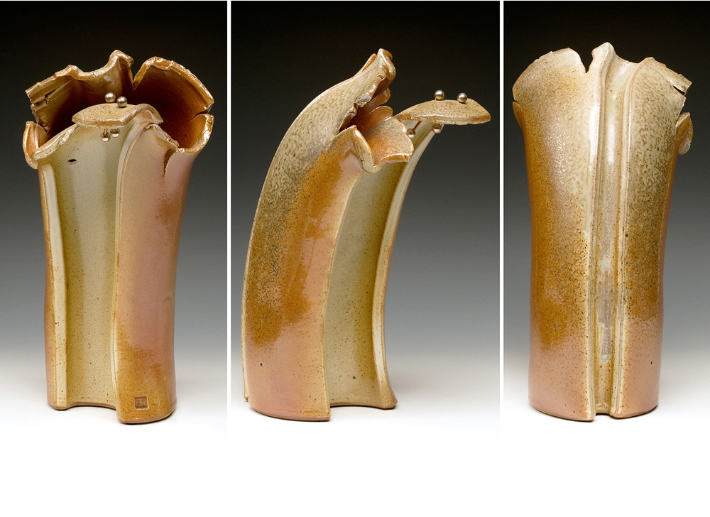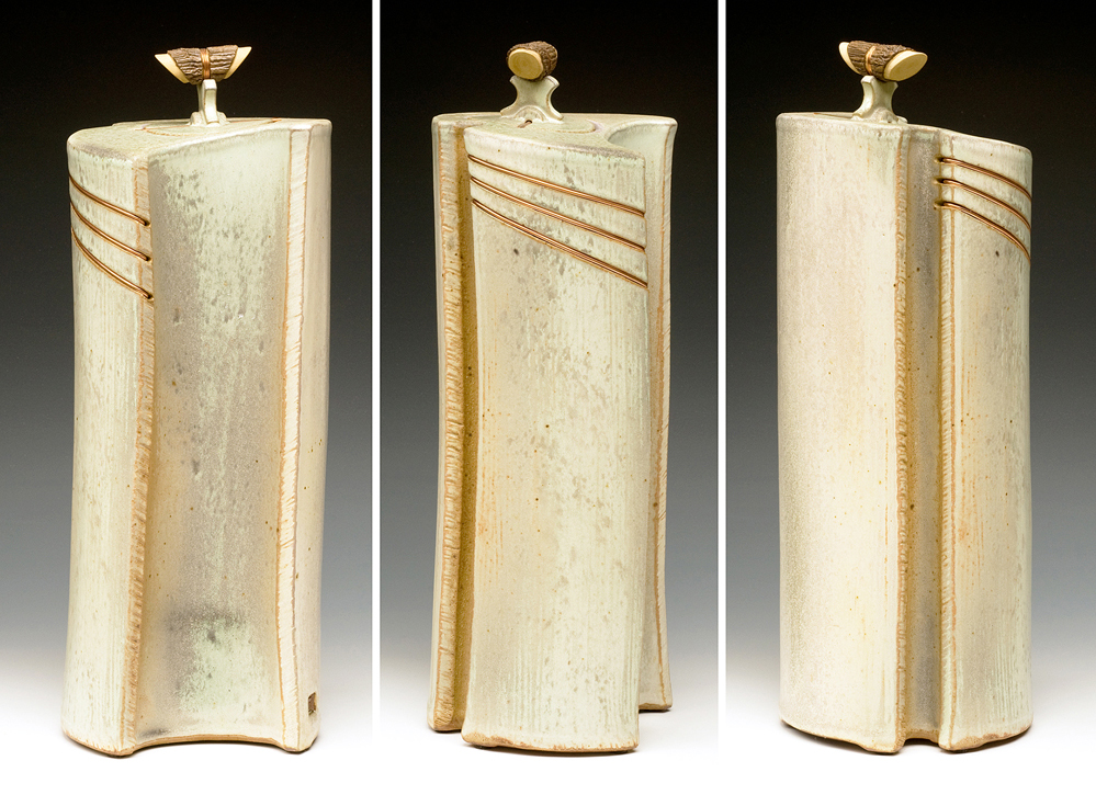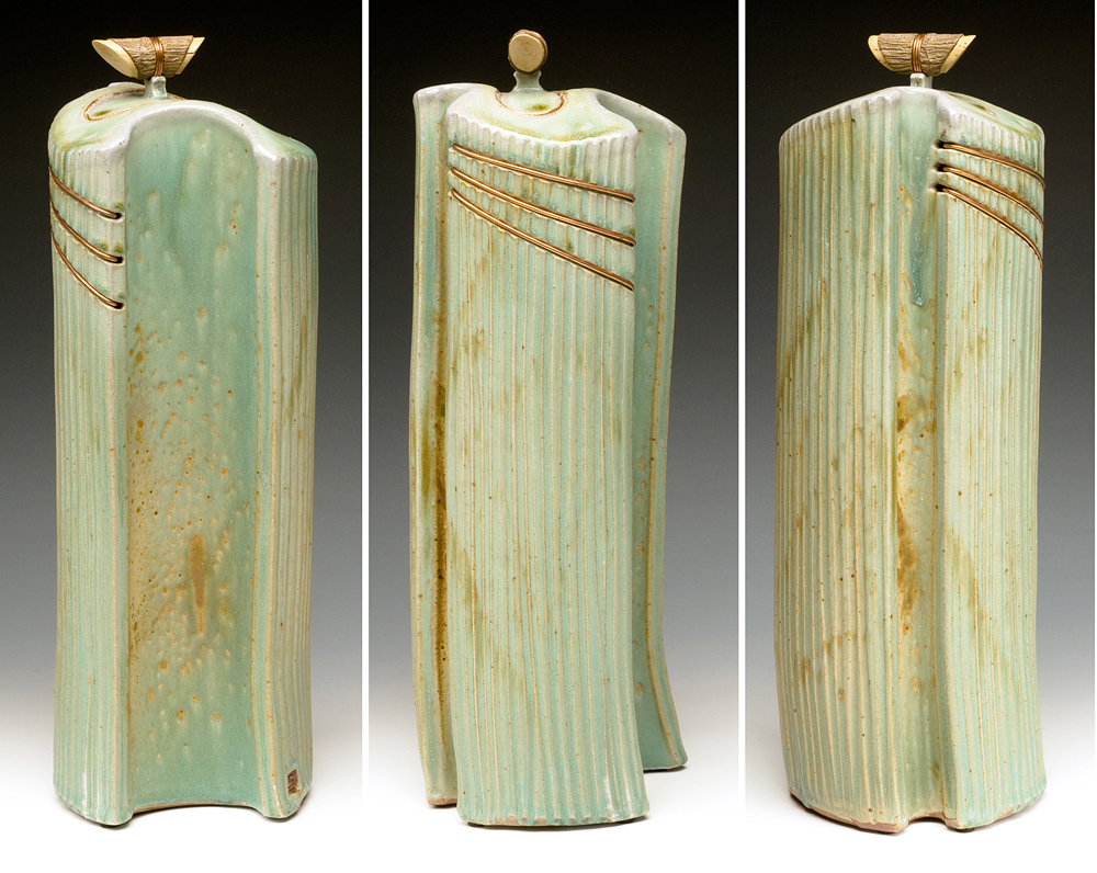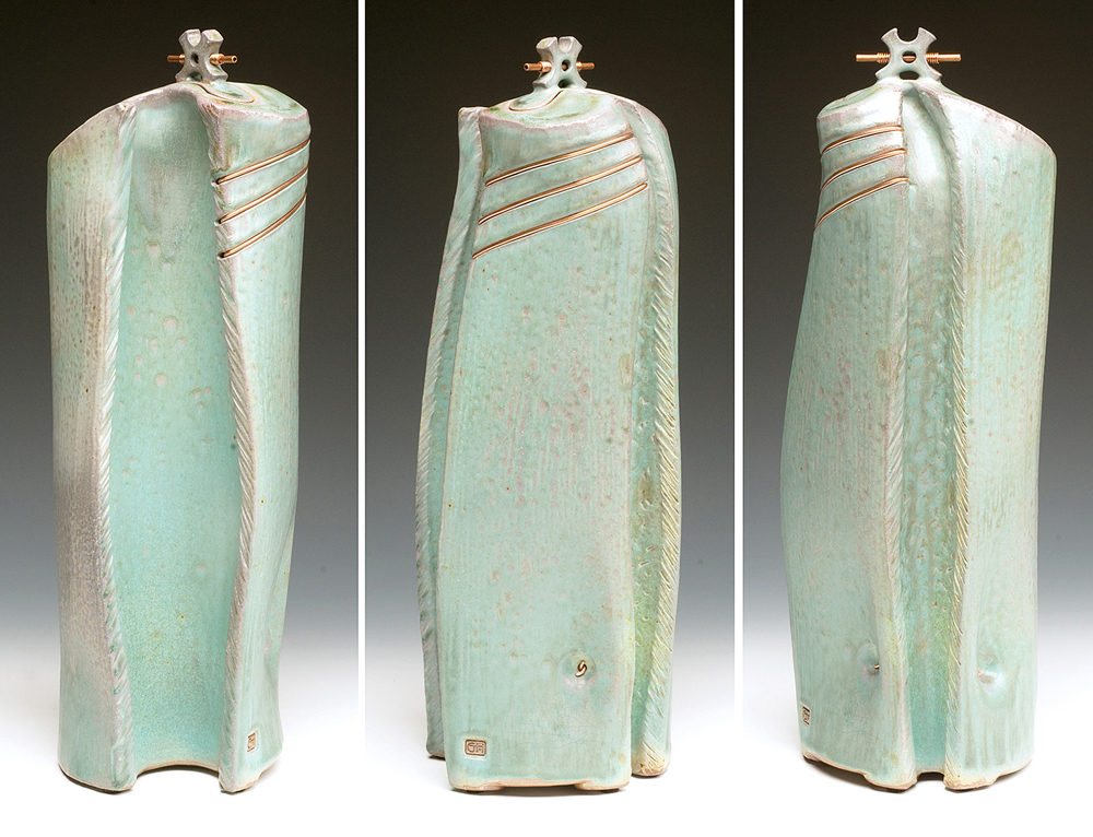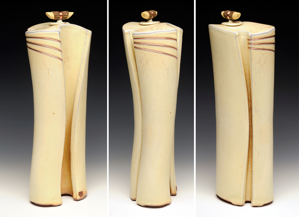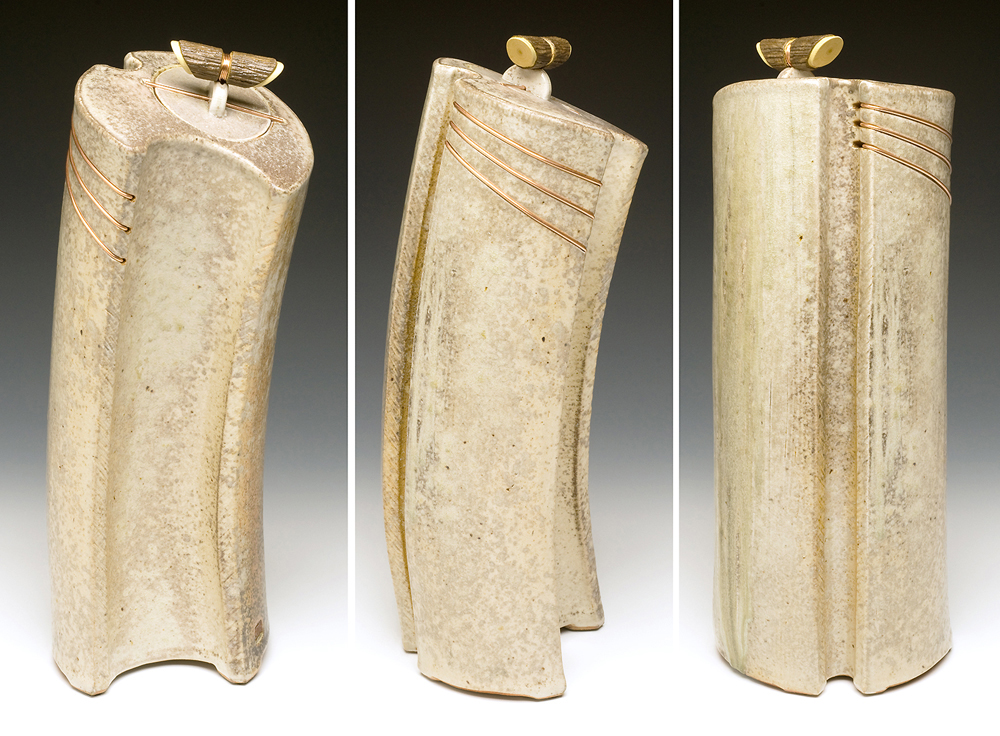 The below work consists mostly of wood/salt-fired, hand-built, medium to large vessels (~12″- 19″ tall) using rolled slabs, extruded and wheel thrown forms. The vessels with lids have special handmade copper or copper/wood finials.
